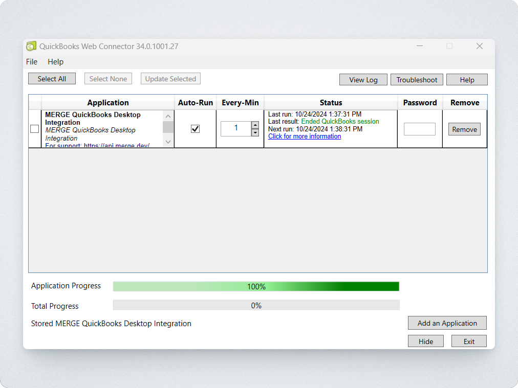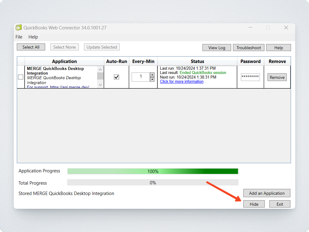 That's it! You can now hide the QuickBooks Web Connector by selecting the Hide button in the bottom right corner