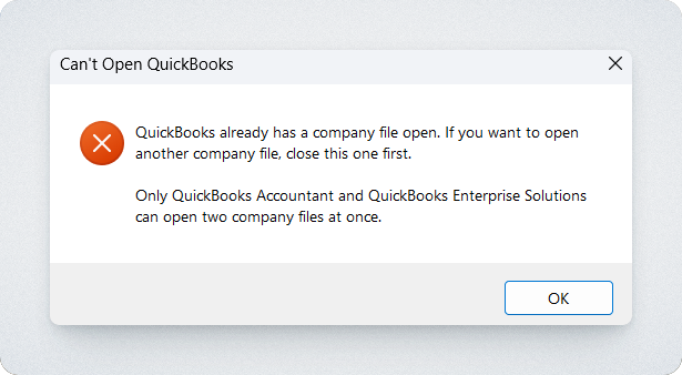 I am seeing a "QuickBooks already has a company file open error".