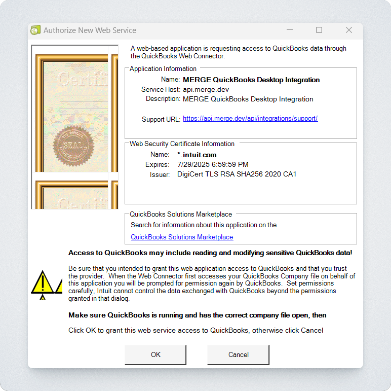 After opening the configuration file, a window will open in your QuickBooks Web Connector prompting you to connect (though it may take a few seconds). Click OK in the popup.