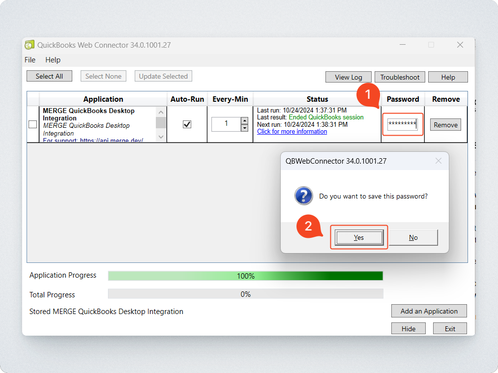 Input your password into the QuickBooks Web Connector