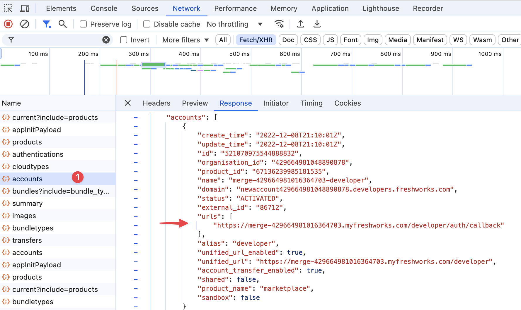 In the Network tab of the developer tools, look for a request to the "accounts" endpoint.