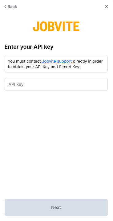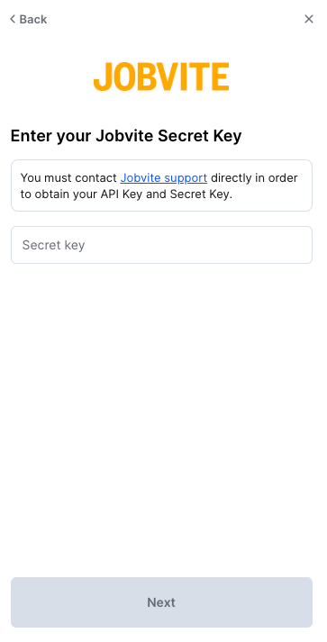 Jobvite will provide you with an API key and a secret key which you will need in the next and final step