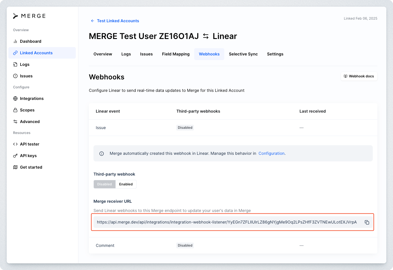 Input the Merge receiver URL you copied from Step 1 into the Webhook URL field