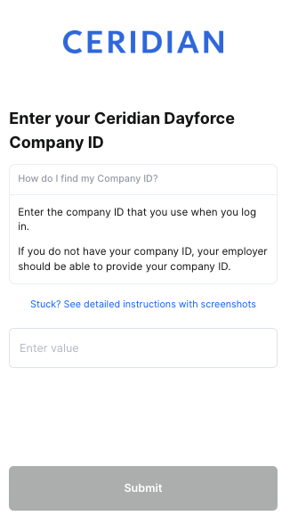Gather your Company ID, User Name, and Password. Enter them into the linking flow and click Submit