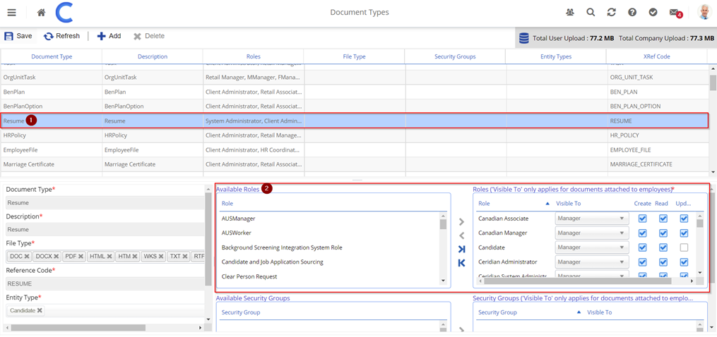 (OPTIONAL) Your user role must have access to Resume and Supporting Candidate Document under Documents > Admin > Document Types.