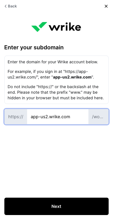 For example, if you sign in at "https://app-us2.wrike.com/" or when you're in workspace "https://app-us2.wrike.com/workspace{restOfUrl}", enter "app-us2.wrike.com".