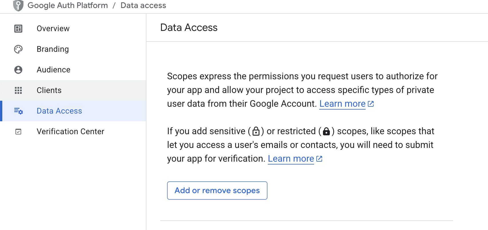 Under Data Access, you'll need to add scopes. Please include the following scopes based upon the authentication method your end users will select in Merge Link: