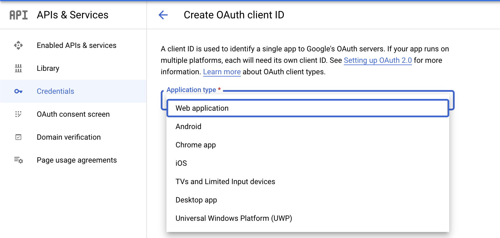 Click +Create Credentials and begin steps to create an OAuth Client ID.
