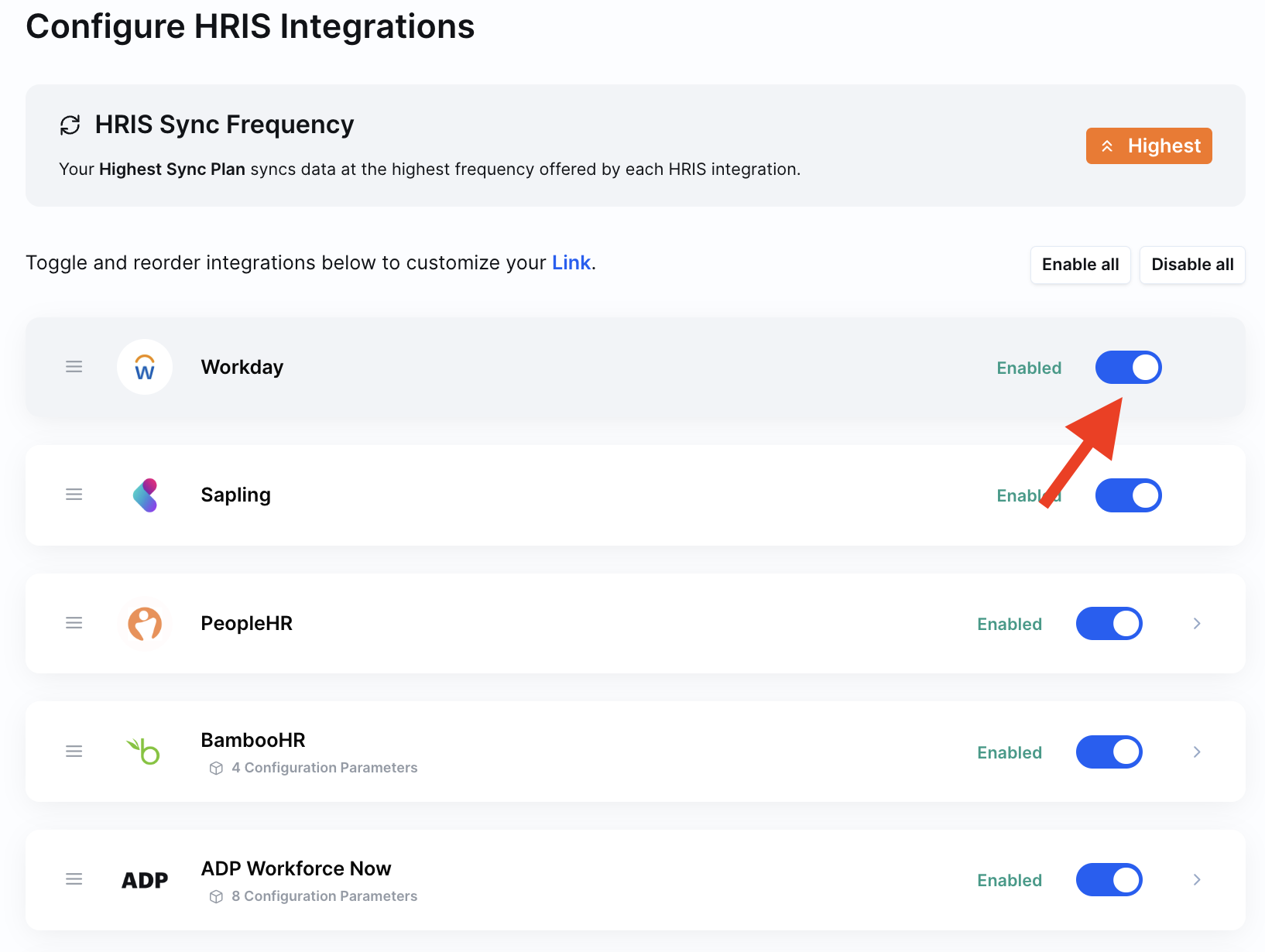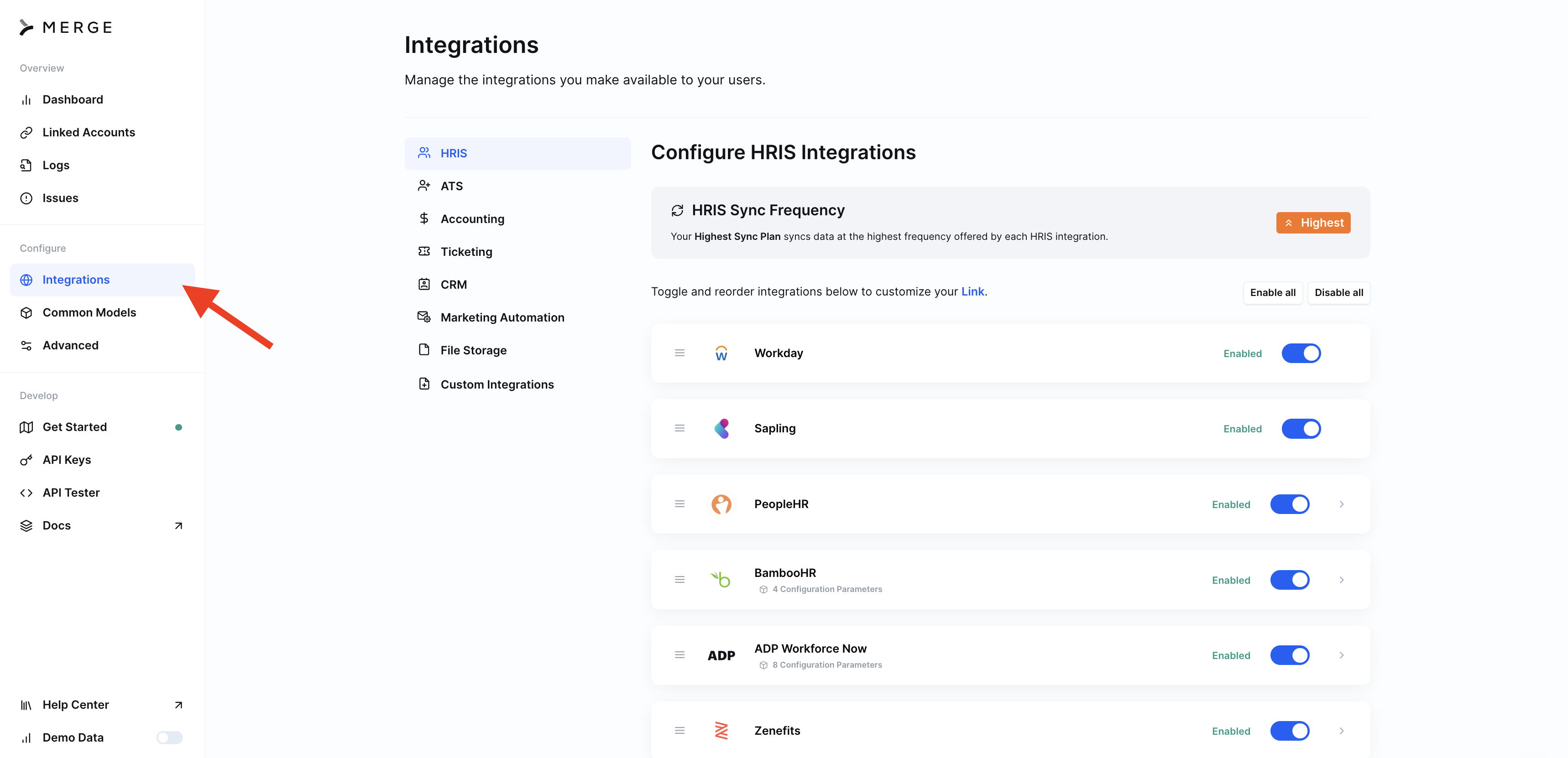 Note: If any your users have any active linked accounts with an integration, you won't be able to disable that integration.