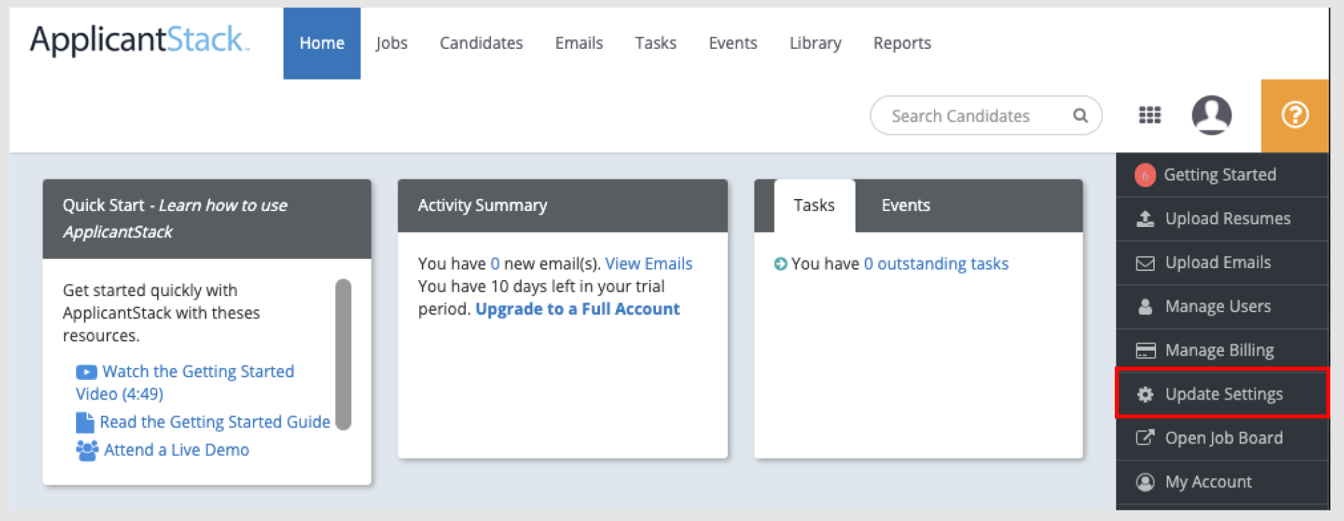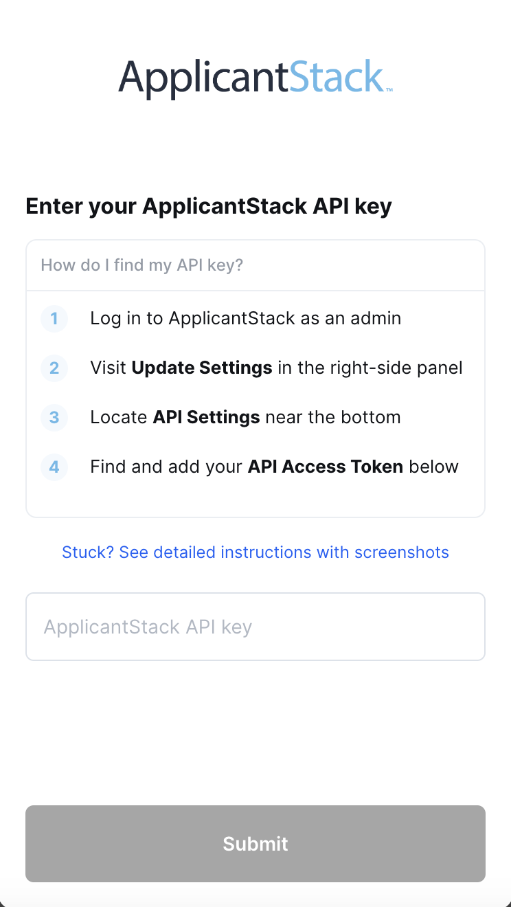 Please ensure you have Admin permissions in your company's ApplicantStack instance or someone has shared their access with you.