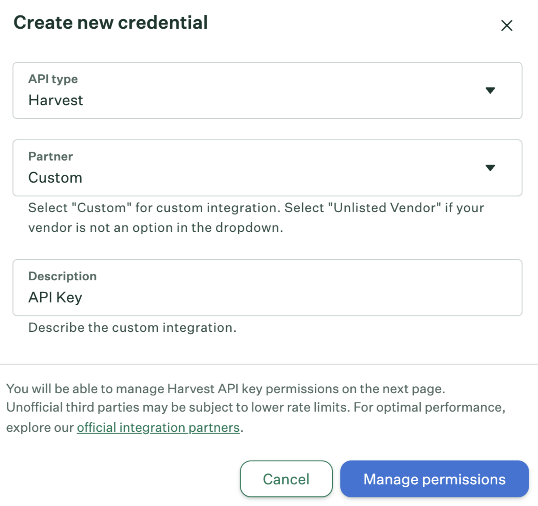 Select Harvest for the API Type, "Custom" under Partner, and enter a description for the API key. Then click Manage Permissions: