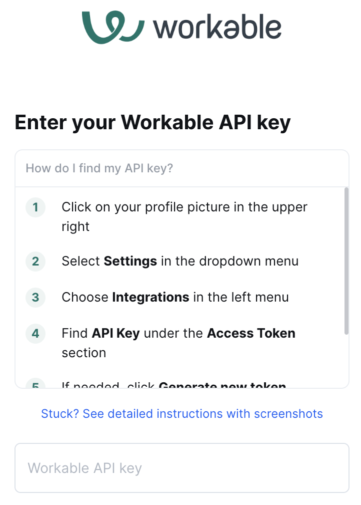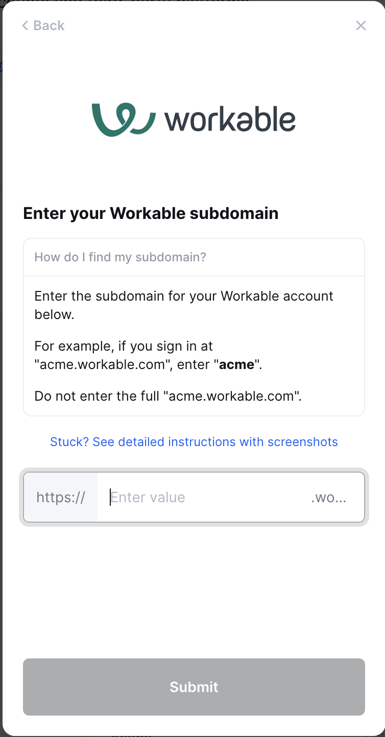 Back in the linking flow, enter the subdomain that appears when you log into Workable. For example, for company-name.workable.com, please enter company-name. Do not enter the full {companydomain}.workable.com