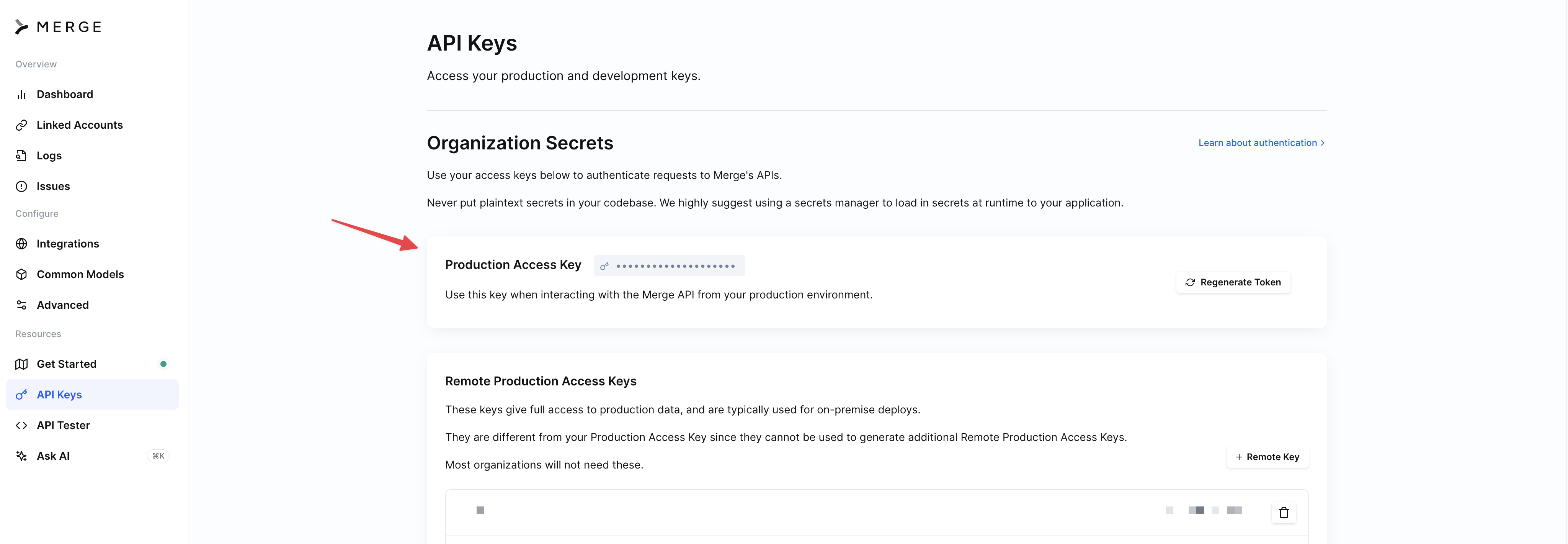 Using a Production Access Key once you have Merge Link embedded (learn more) will result in linked accounts being automatically created as Production Linked Accounts. You can generate a Production Access Key in the API Keys section of the dashboard:
