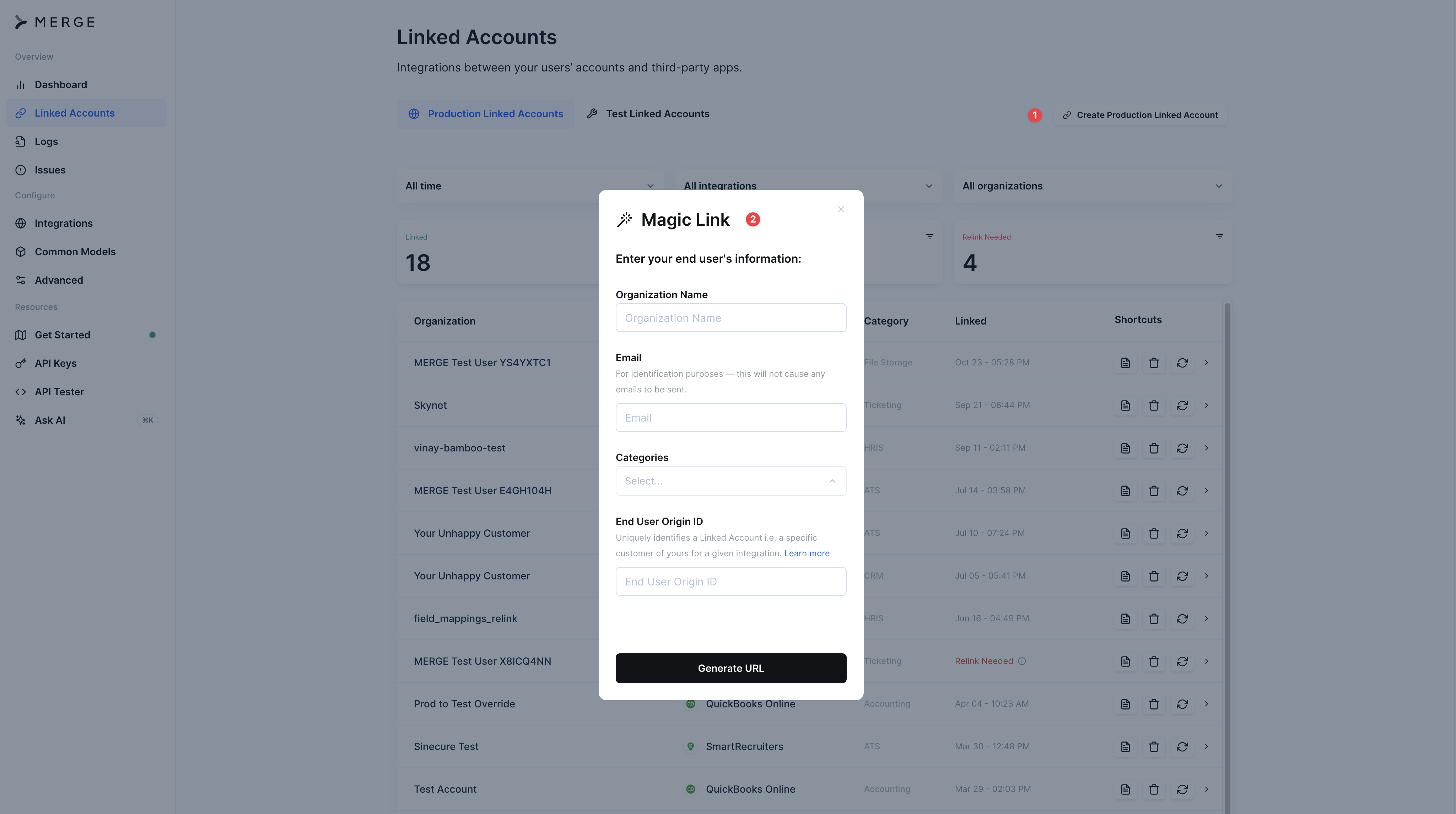 You can create Production Linked Accounts via Magic Link in the Merge Dashboard. On the Linked Accounts page, click Production Linked Accounts at the top. Now hit "Create Production Linked Account". Fill out the form, and you'll be given a URL you can use to open Merge Link in your browser. You can learn more about Magic Link here.