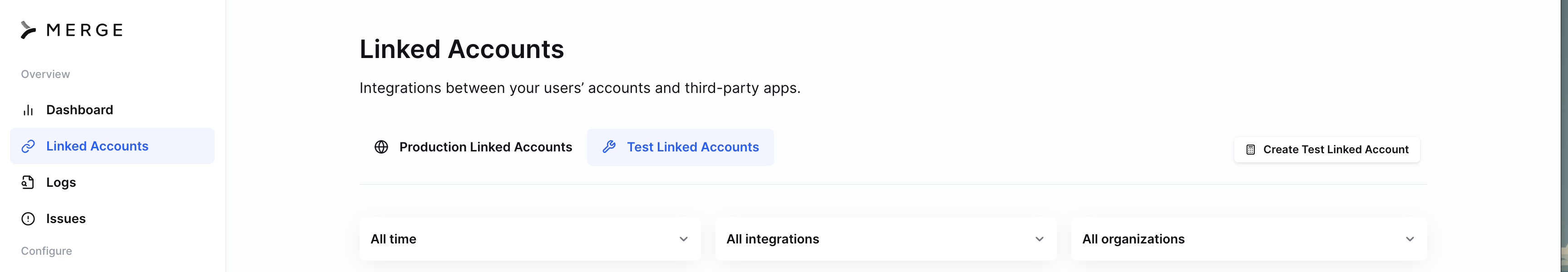 To create a Test Linked Account, navigate to the Linked Accounts section of the Merge Dashboard. Click on Test Linked Accounts > Create Test Linked Account.