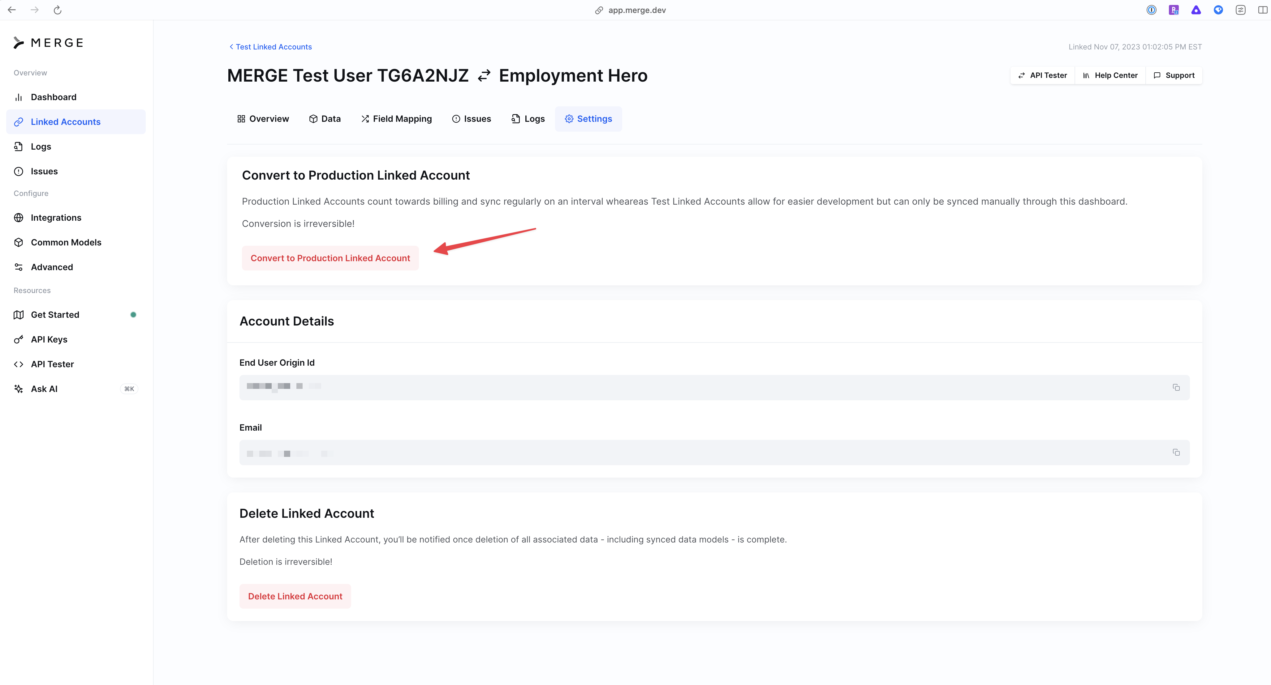If you want to convert a test linked account to production, you can select the account, navigate to the Settings page, and select "Convert to Production Linked Account"