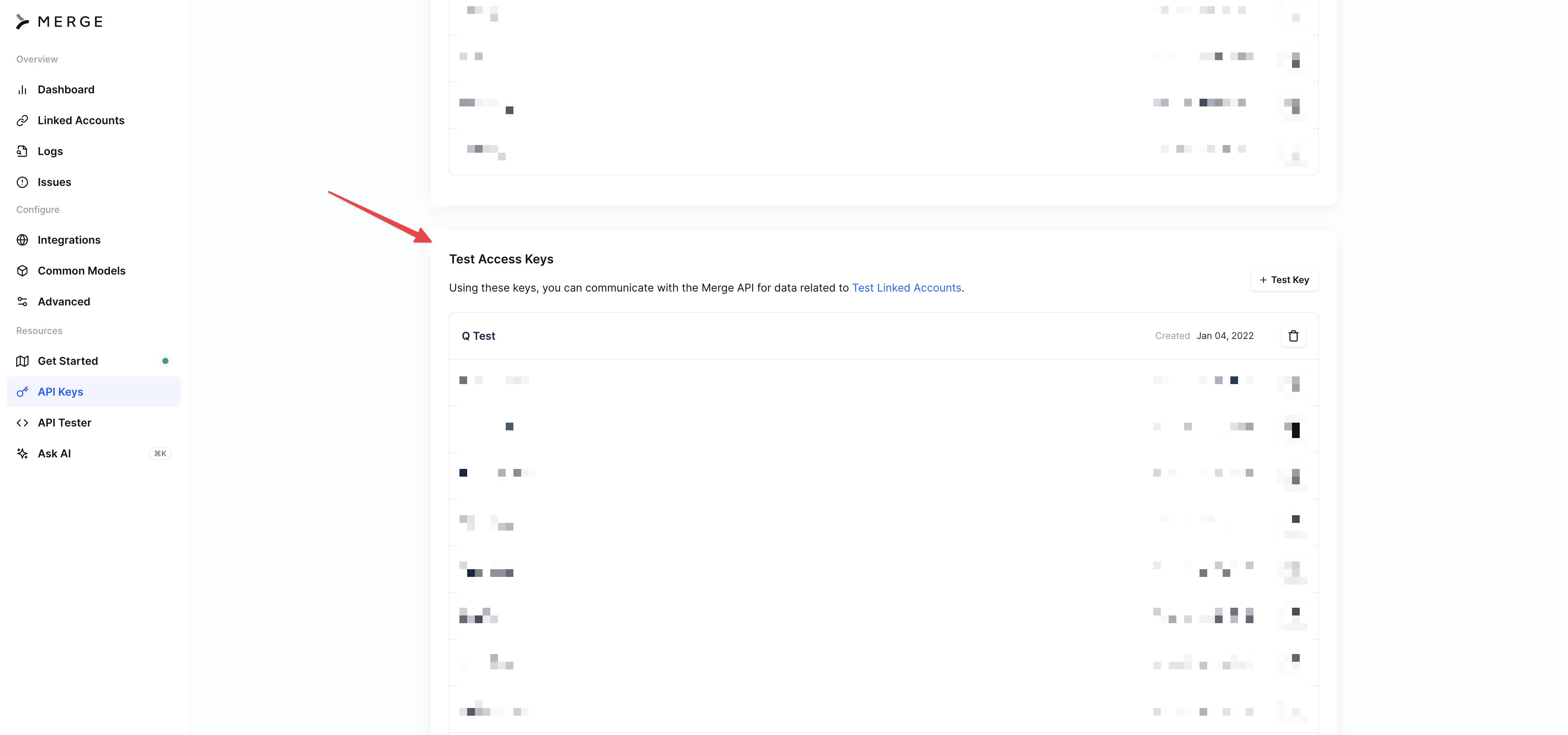 Using a Test Access Key once you have Merge Link embedded (learn more) will result in linked accounts being automatically created as Test Linked Accounts. You can generate a Test Access Key in the API Keys section of the dashboard: