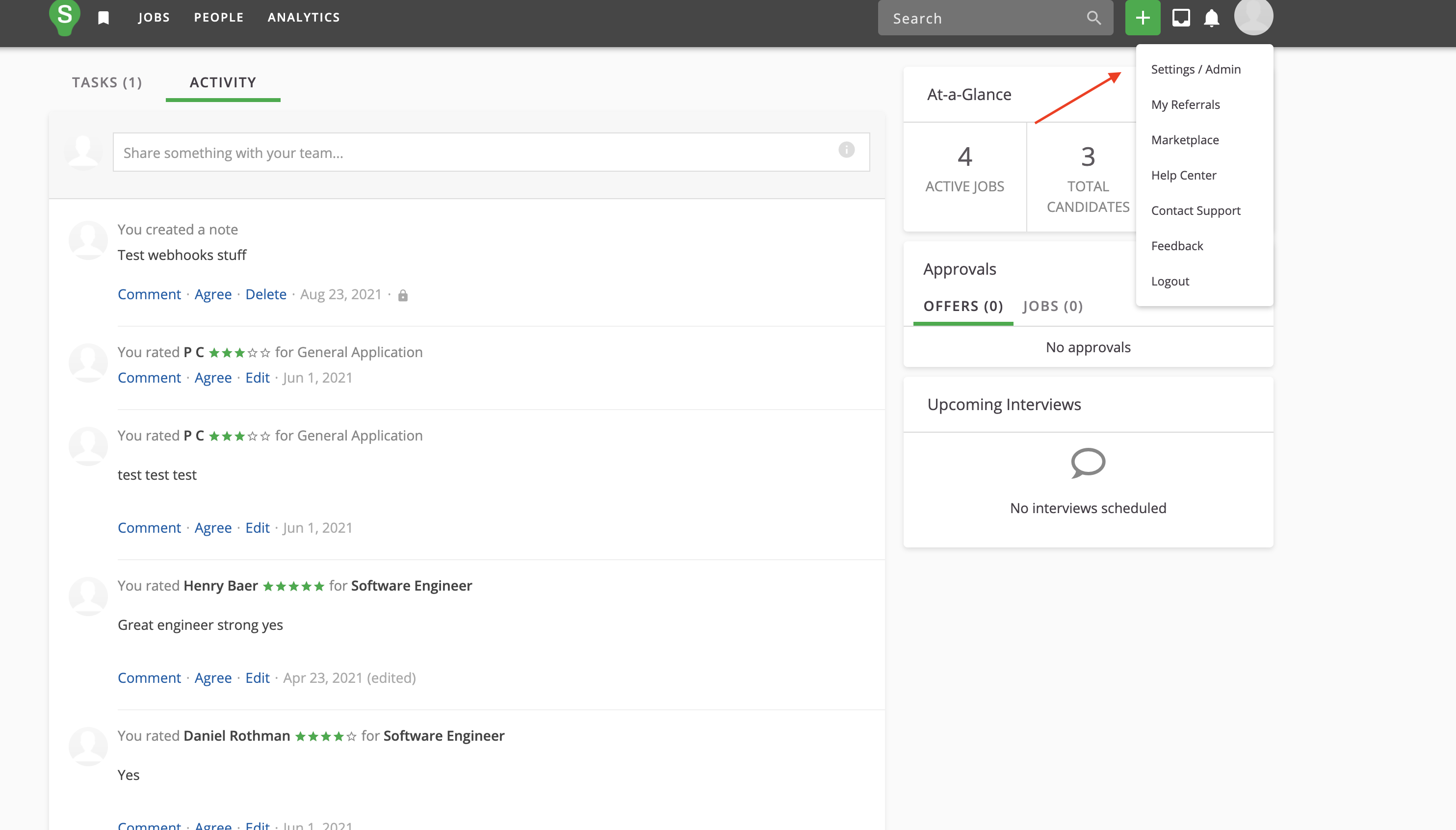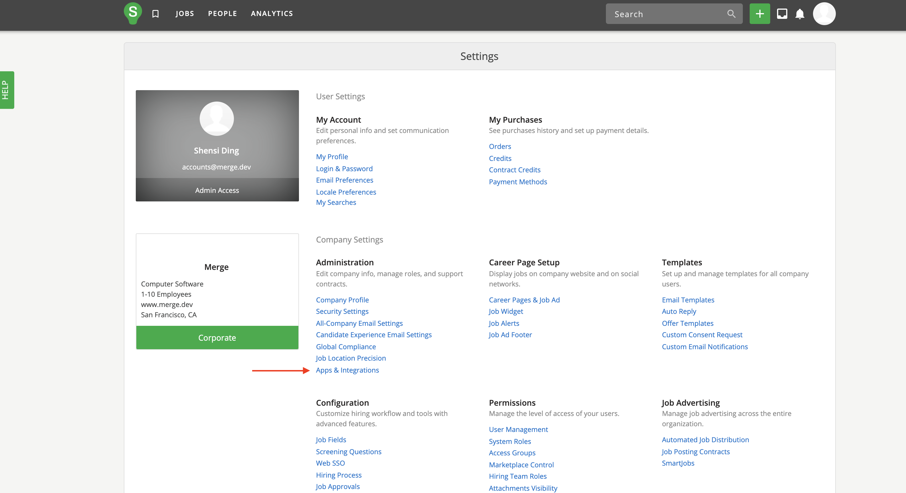 Sign in to SmartRecruiters, click your name in the upper-right to show the dropdown menu, and click on Settings / Admin in the menu