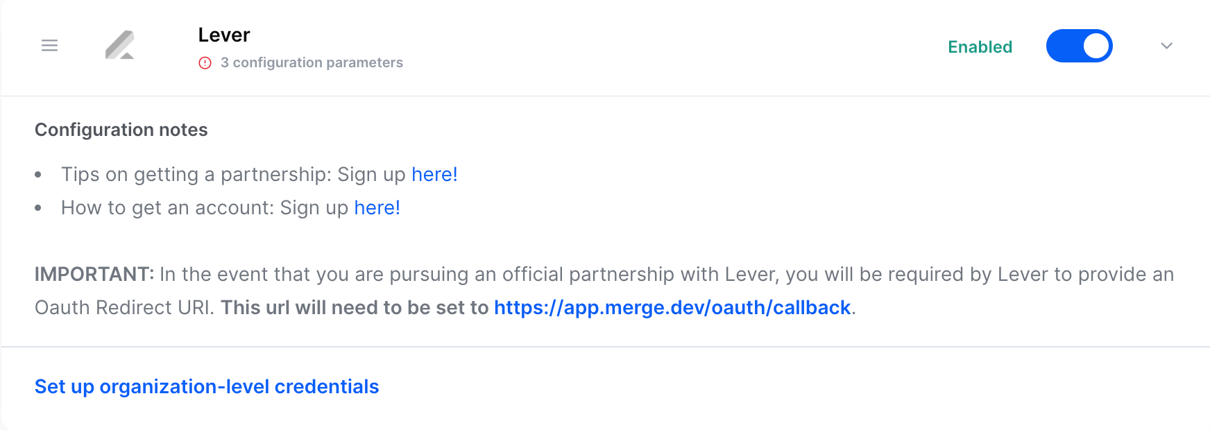 This guide will walk through the steps to enter your Lever partnership credentials into Merge to allow your customers to connect their Lever accounts using OAuth.