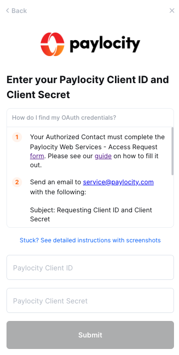Paylocity will provide you with your Client ID and Client Secret, which you can enter into the linking flow. For further information, you can find full details on Paylocity's website here.