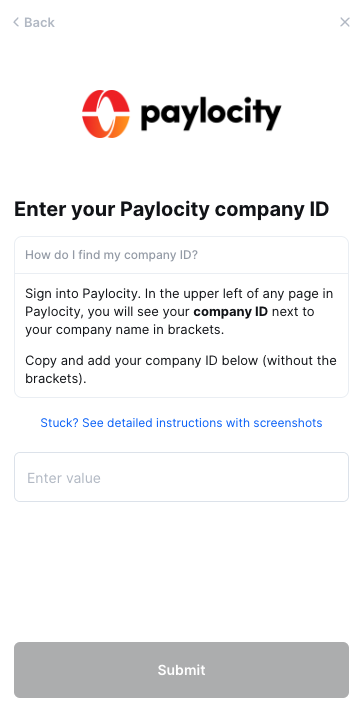 Your Company ID is the ID you used to login into Paylocity, and it will be the same ID you see in the upper left-hand corner of your Paylocity portal. Enter your Company ID into the linking flow.