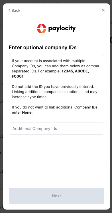 If you are using multiple companies within your Paylocity account which you want to link, enter any additional company IDs on the Enter optional company IDs step