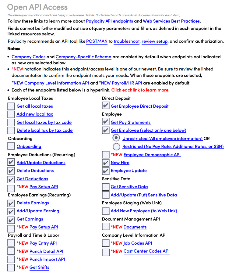 Note: Get Employee is a required permission to authenticate the linking flow, but only endpoints needed for your integration should be selected. For example, if you don’t need Pay Statements, Deductions, or Earnings, remove those from the permissions.