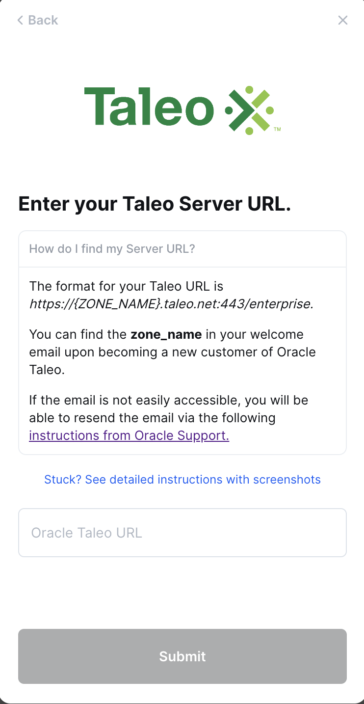 Step 6: Enter your Taleo Server URL into the linking flow