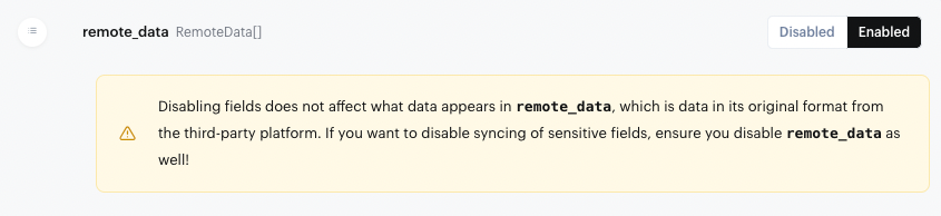 Note: When disabling Common Model fields in your dashboard, remote_data will not be affected. In order to disable syncing of sensitive fields, you should disable remote_data as well.