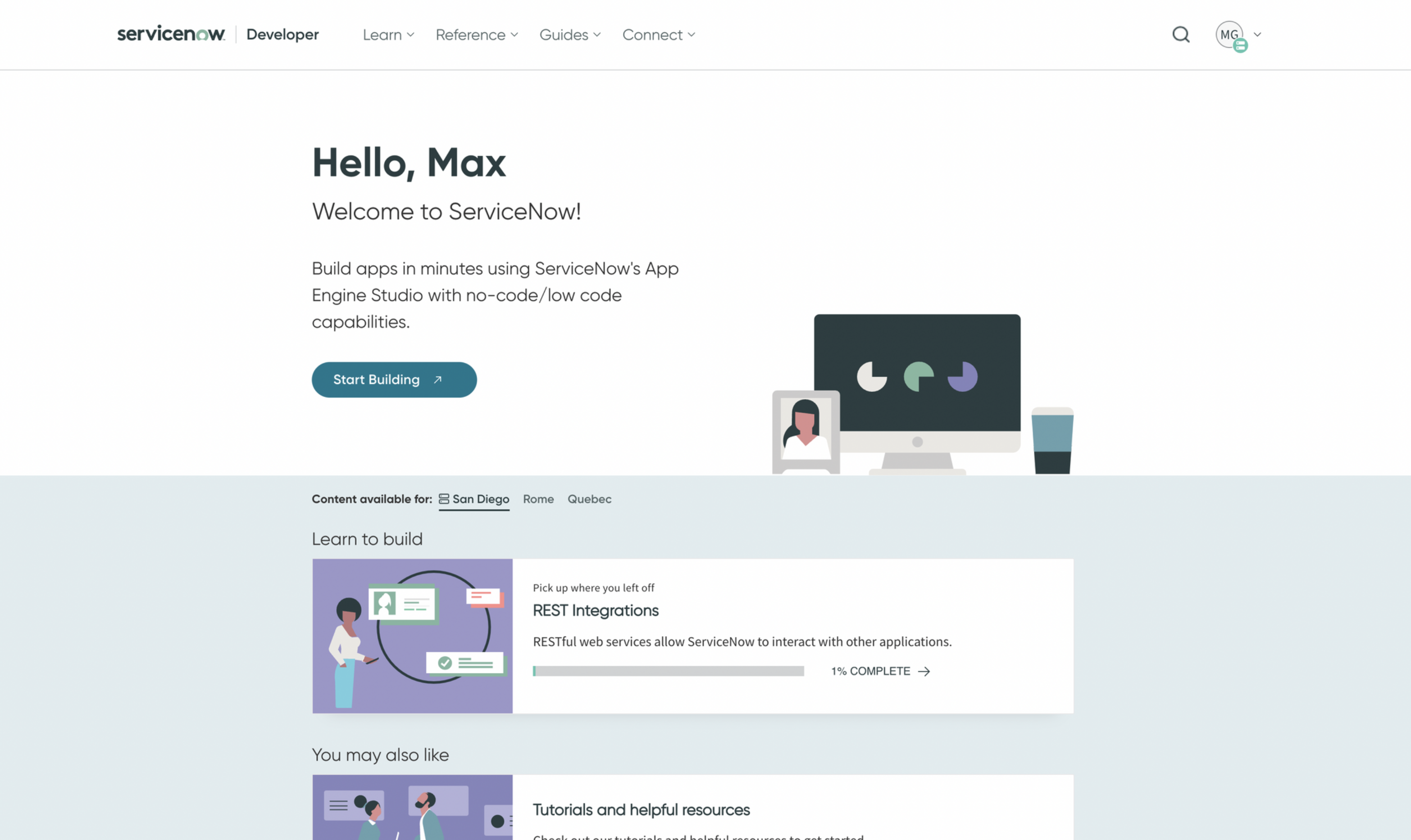 Navigate to https://developer.servicenow.com/dev.do#!/home.