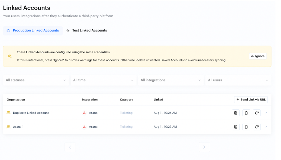 Clicking Review Duplicates will take you to a filtered view of the Linked Accounts page, where you will see Linked Accounts that are duplicates of each other.
