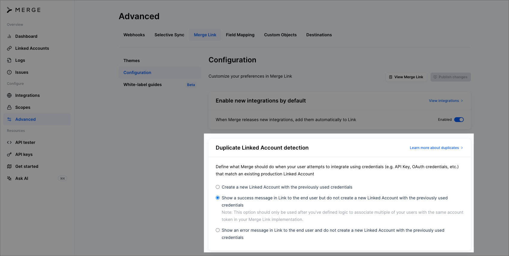 Merge offers options that enable you to decide how you would like Merge Link to behave when we detect an end user attempting to integrate a third-party account that has already been integrated.