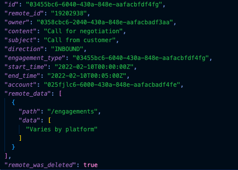 The Engagement Types common model object provides high level information about the specifics of a given engagement. Engagement Types can also be used to see the range of possible engagements in a given CRM. This would be returned through the "activity_type" field. This Enum field can include values such as "CALL", "MEETING", "EMAIL", or -in cases where there is no clear mapping - the original value passed through.