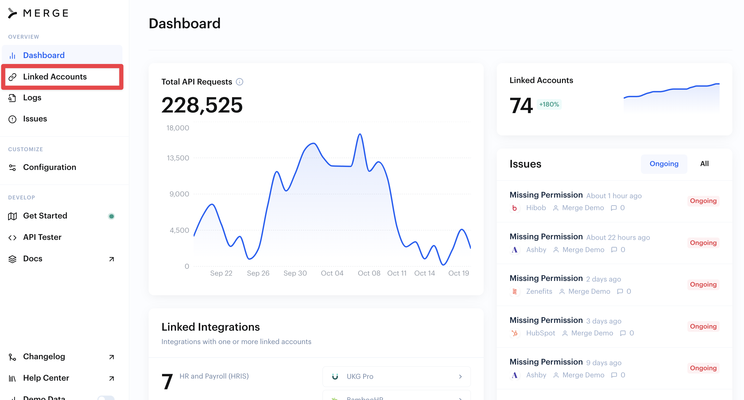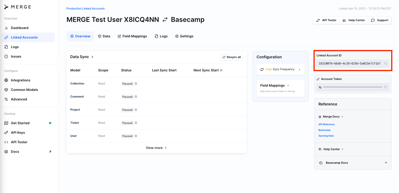 https://app.merge.dev/linked-accounts/account/15a56fb2-6efd-4fb6-a63b-f1ee3a4895e1/overviewIn this example, the Linked Account ID is: 15a56fb2-6efd-4fb6-a63b-f1ee3a4895e1