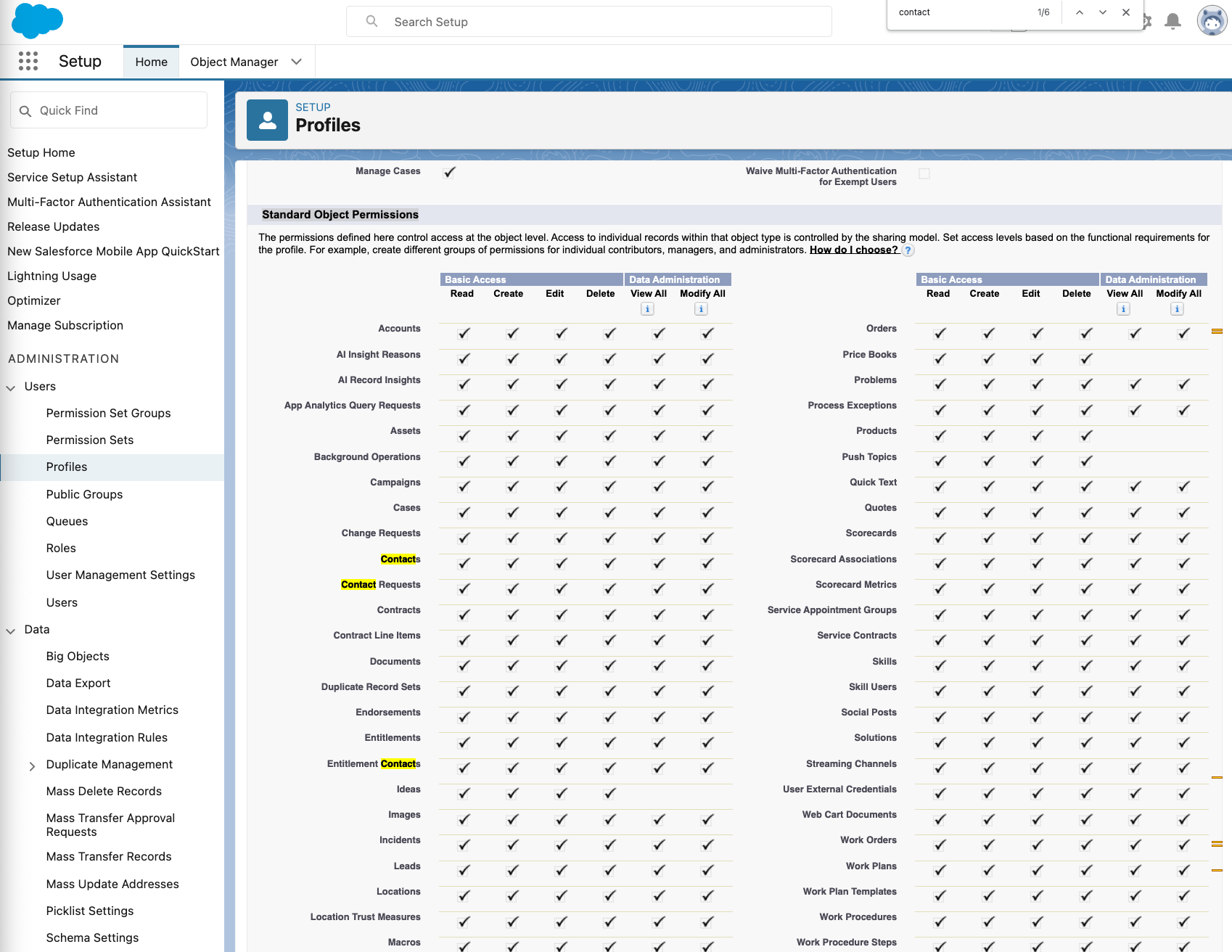 Access Contacts | Contacts: Read, Write, Edit, View All | Find under a user’s Profile > Standard Object Permissions |