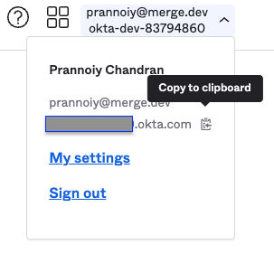 Login to Okta. Click on your Profile in the top right corner, copy the domain (including .okta.com) below your email
