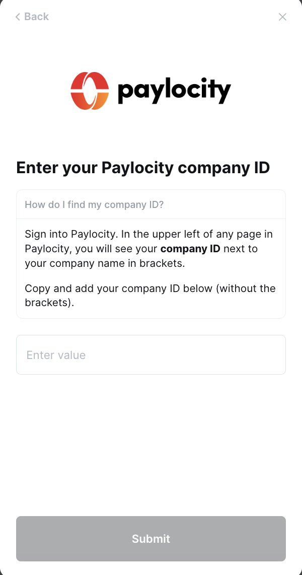 Once Paylocity confirms your request, input your Company ID into the linking flow