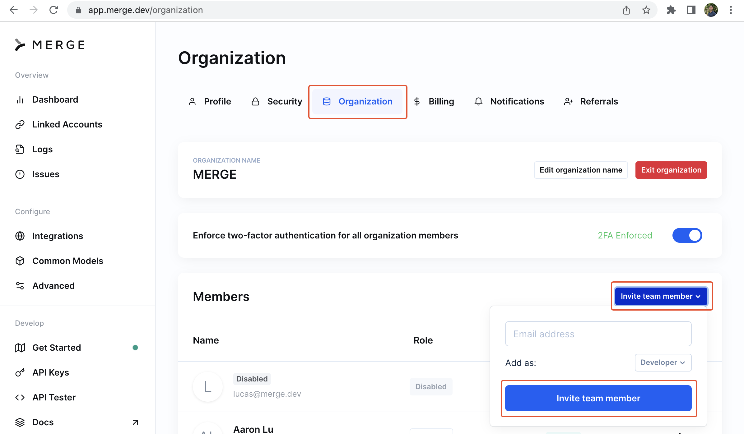 Navigate to the Settings page of the Merge dashboard by hovering over your name in the bottom left-hand corner of the page and selecting Settings.