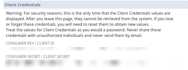 Consumer Key: Confirmation screen after creating the integration (Step 6)