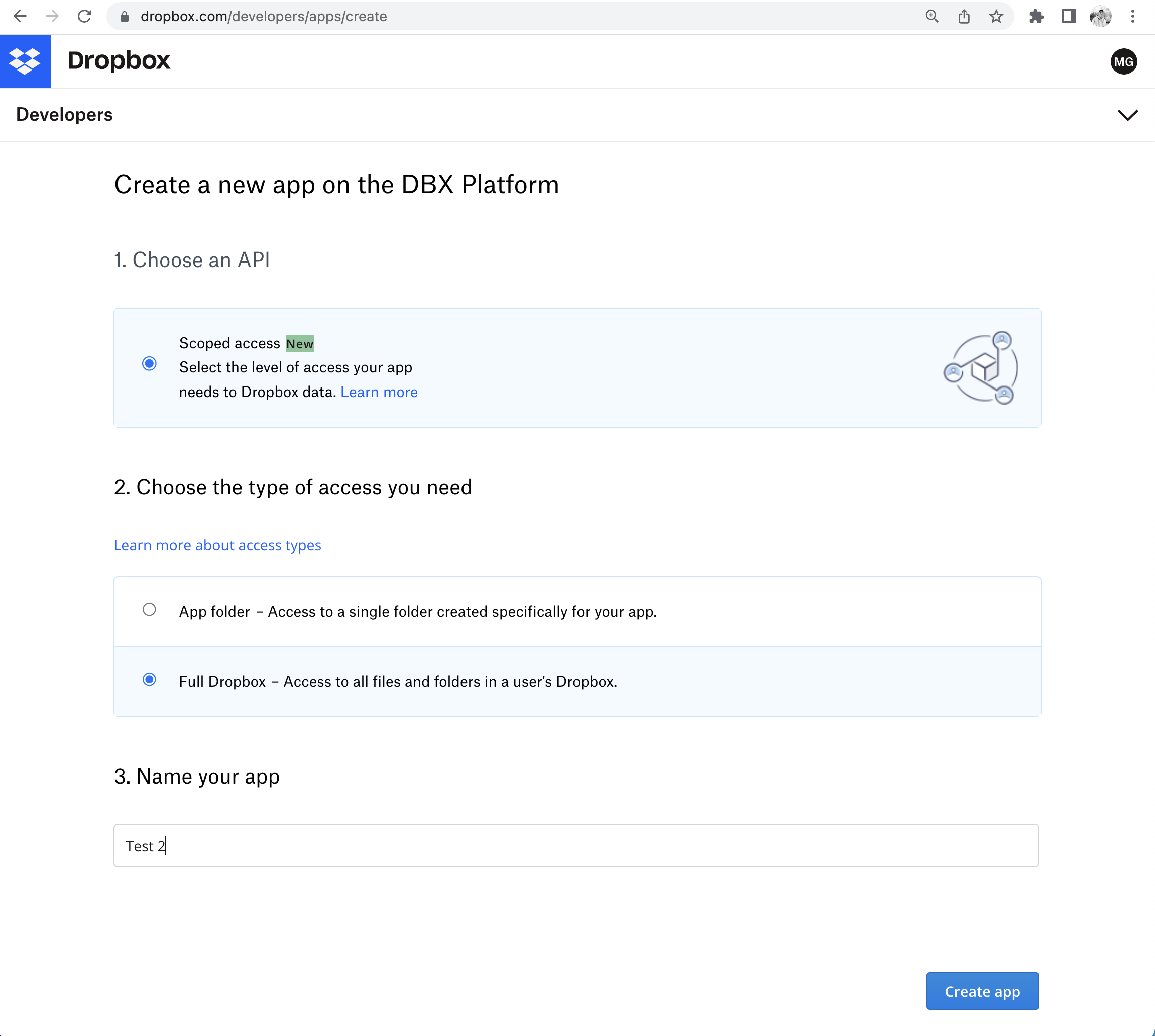 Choose “Scoped access” and “Full Dropbox”, so that your app has access to all files & folders.