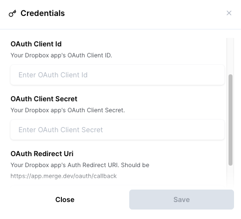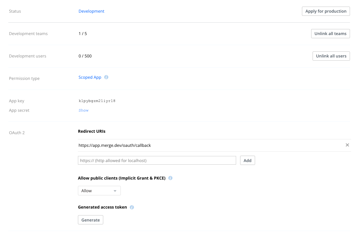 Below are instructions on how to get your Dropbox OAuth app set up with Merge.