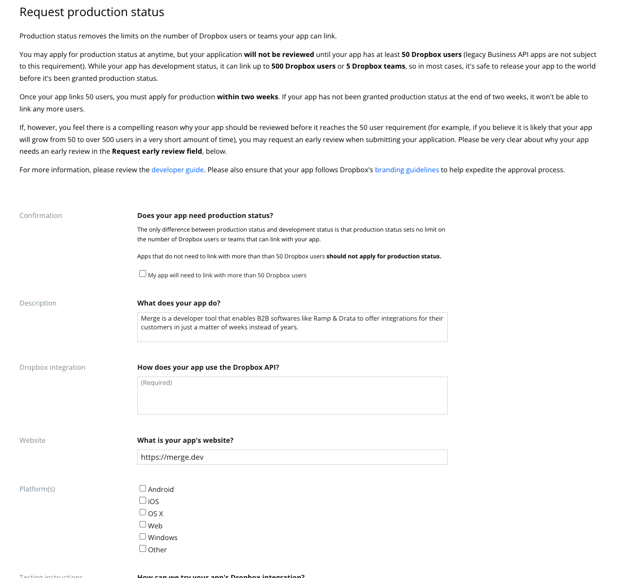 If you have under 50 users or 5 teams, you don't need your Dropbox app to be in production mode in order to support this integration. However, if you'd like to apply for production, follow the steps below: