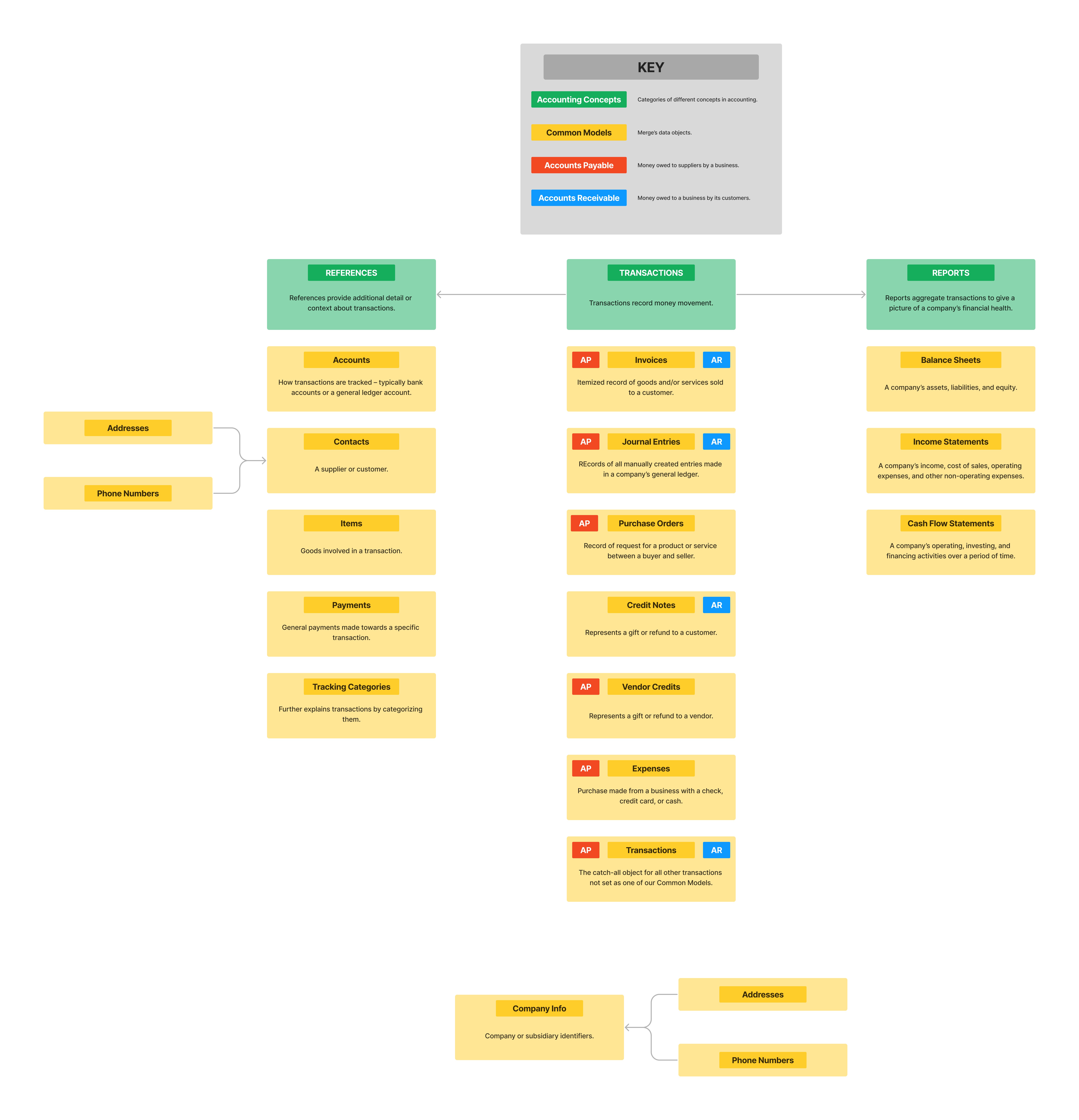 To better understand how our Accounting Common Models interact, you can use this diagram to understand how we split out our different objects into Transactions, References, and Reports.