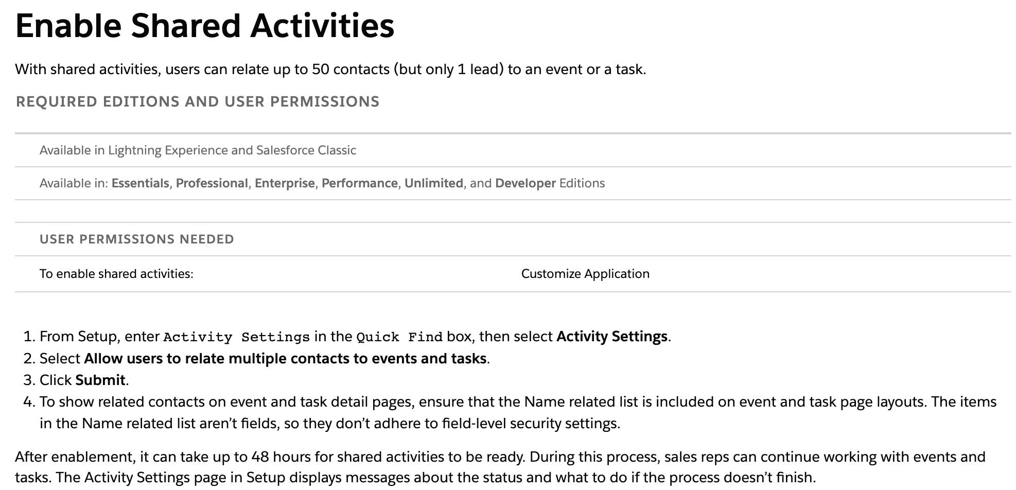Salesforce requires that the Shared Activities setting is enabled for this endpoint to work.