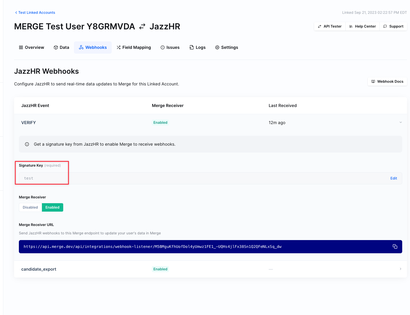 Enable both the VERIFY and CANDIDATE-EXPORT webhooks. Enter the signature key from step 1. Save both.