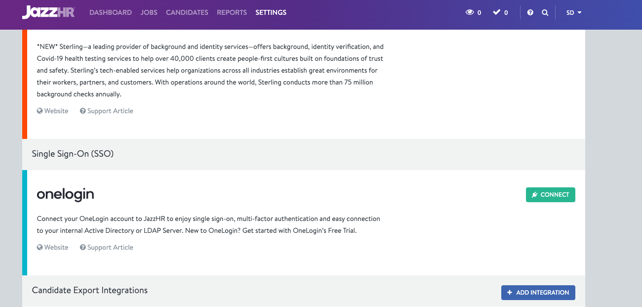Scroll to the bottom. Next to Candidate Export Integrations click Add Integration
