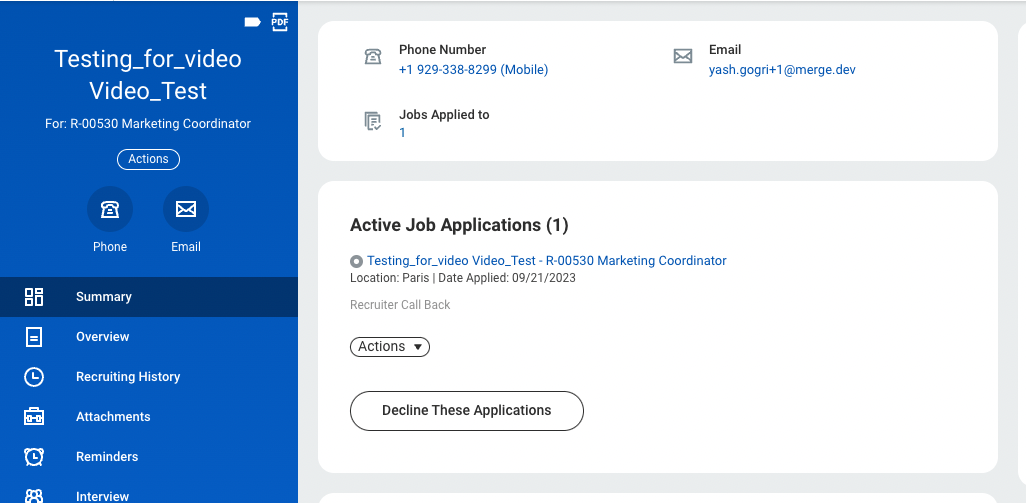 Merge currently supports sending basic Candidate information over to Workday to create a Candidate. We create a Candidate with information: First Name, Last Name, Phone Number, and Email. Once a Candidate is created, Merge has the functionality to tie them to a job, which is detailed in the next few sections!