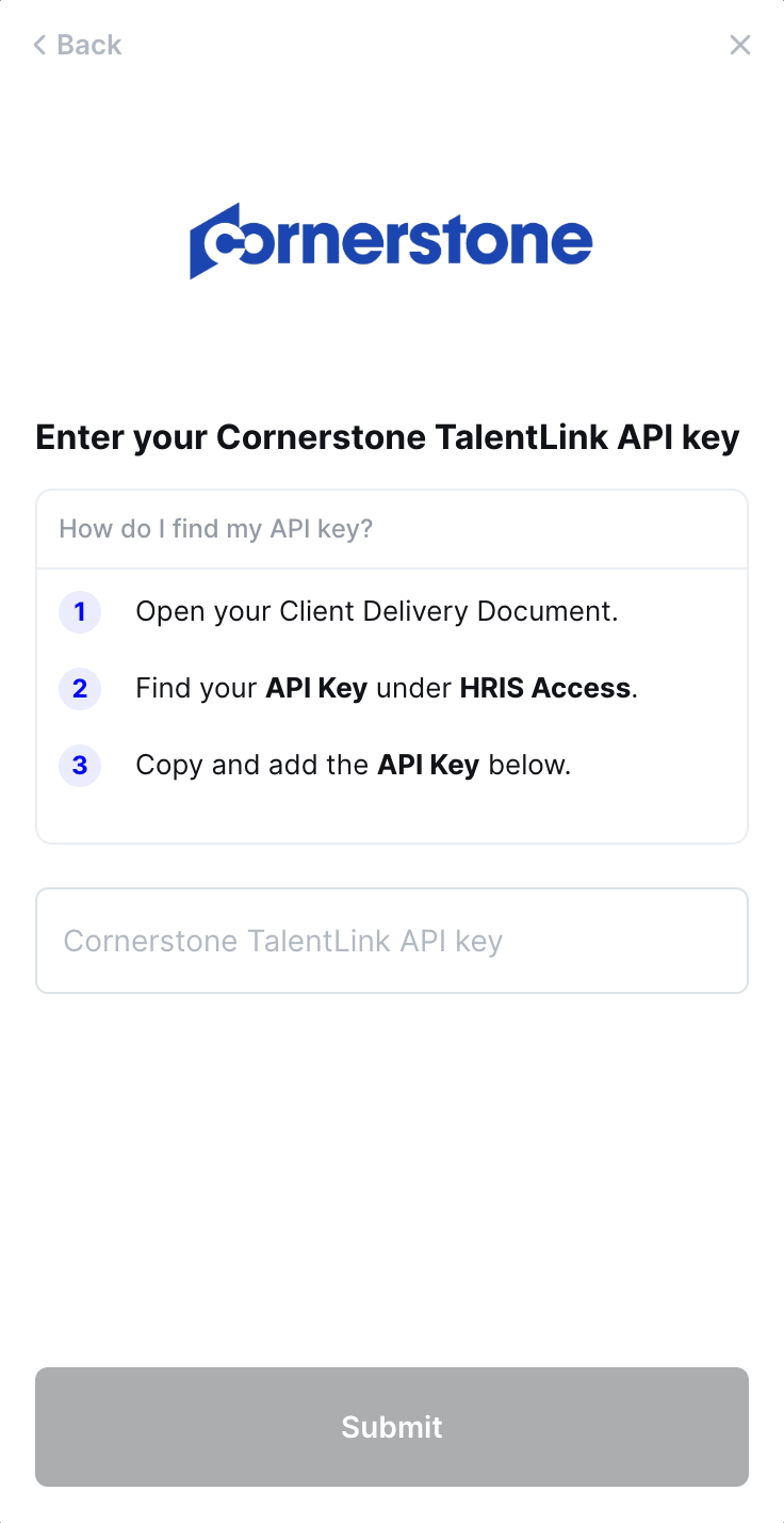 You will receive your API key from the Cornerstone team via a Client Delivery Document
