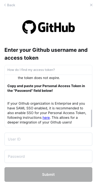 If your Github organization is Enterprise and you have SAML SSO enabled, it is recommended to also enable SSO for your personal access token following instructions here for a deeper integration of Github users!