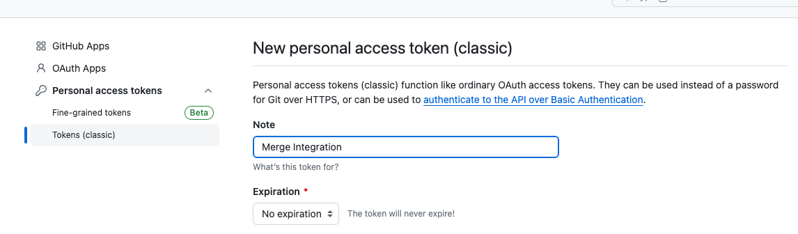 To give your token an expiration, select Expiration, then choose No Expiration